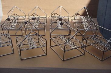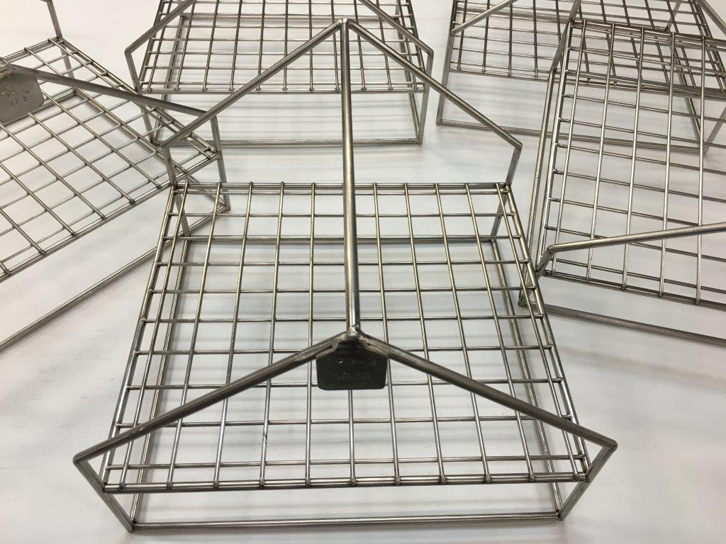 Stainless steel degreasing baskets with 16 compartments and angled handles for easy stacking.