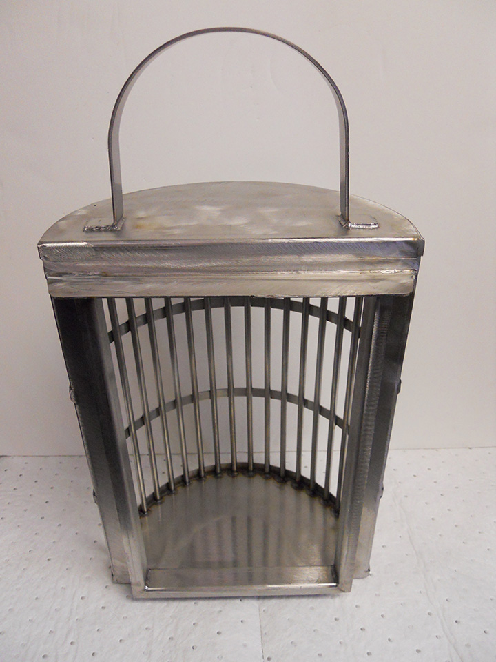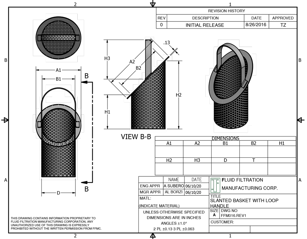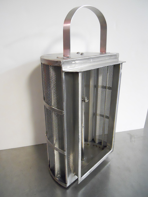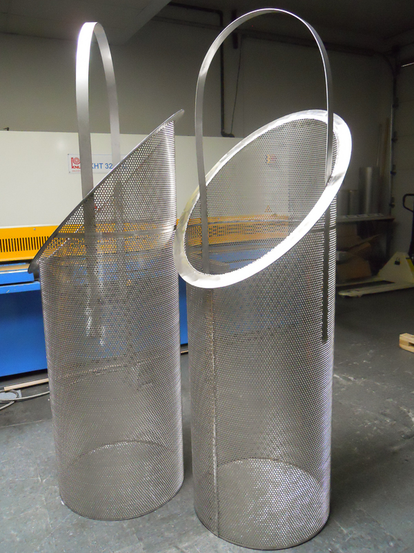 Stainless Steel 316 slanted baskets with solid flanges, perforated bottom and cross bar handle