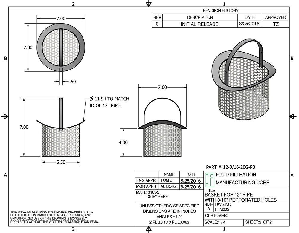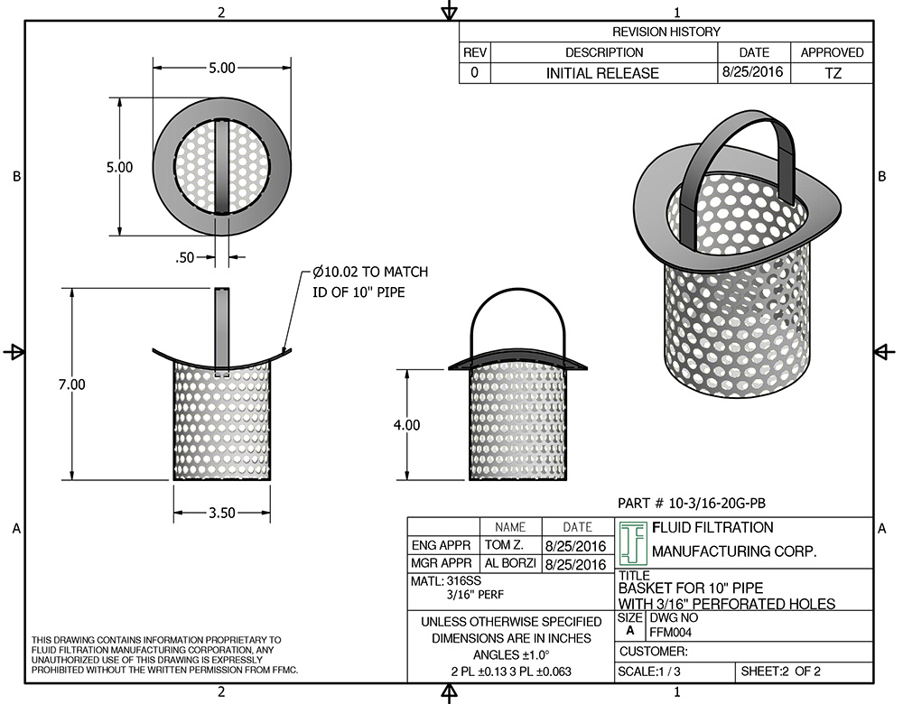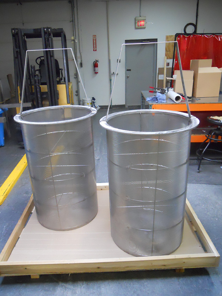 Pipe drainage baskets for 10 & 12 inch pipes in 3/16 perforated holes, 316 stainless steel material