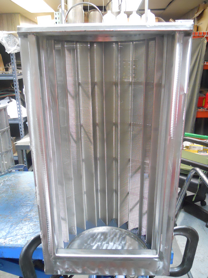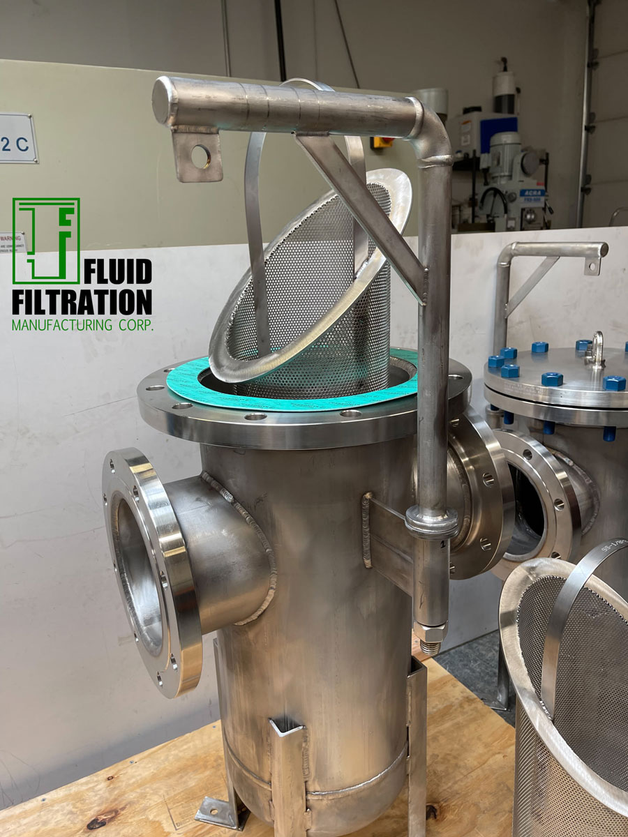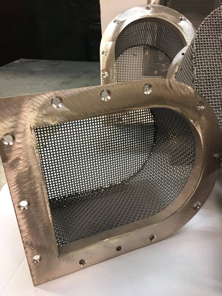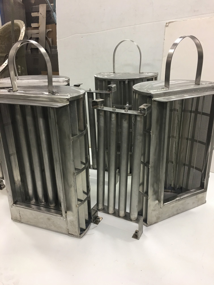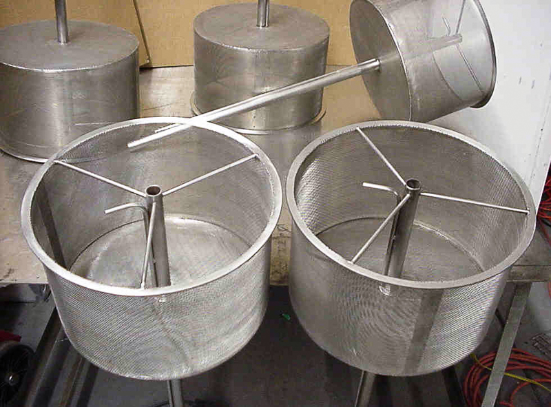 Stainless steel heavy duty reinforced basket strainers with mesh liner used in machine shop industry for collecting metal particles.