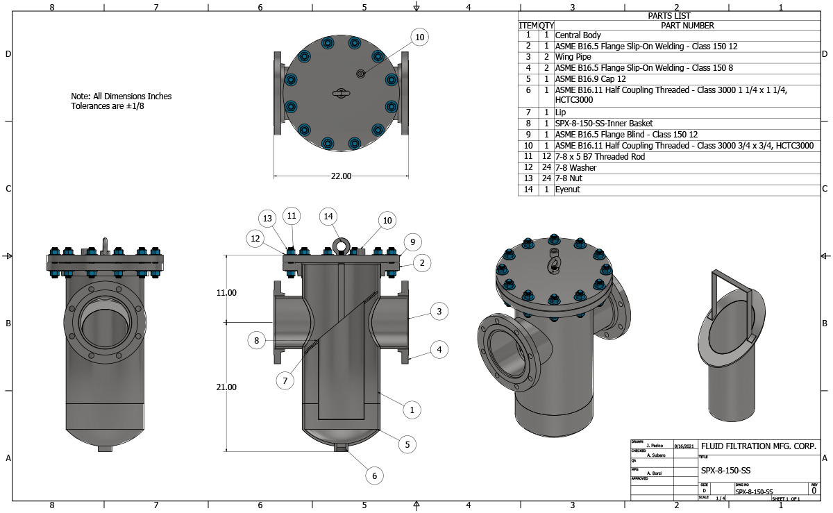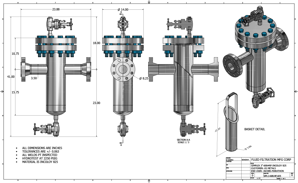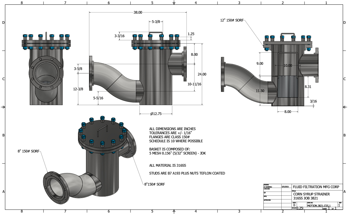 Fabricated simplex strainer, 316 Stainless Steel, size 8.0" 150# flange
