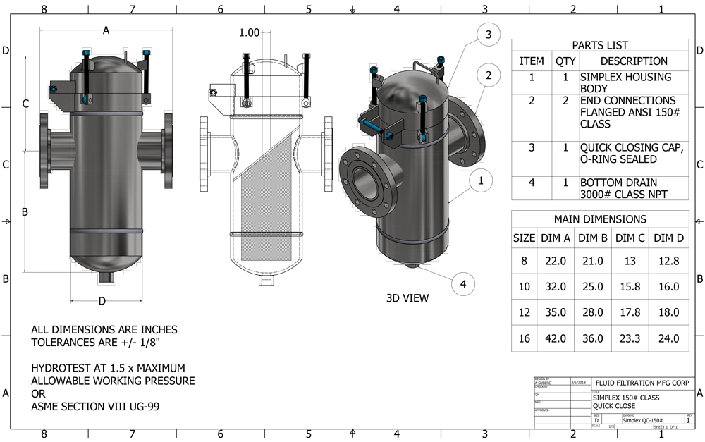 10.0" fabricated carbon steel simplex strainer with 150# raised faced flange with bolted cover and supporting legs and stainless steel basket