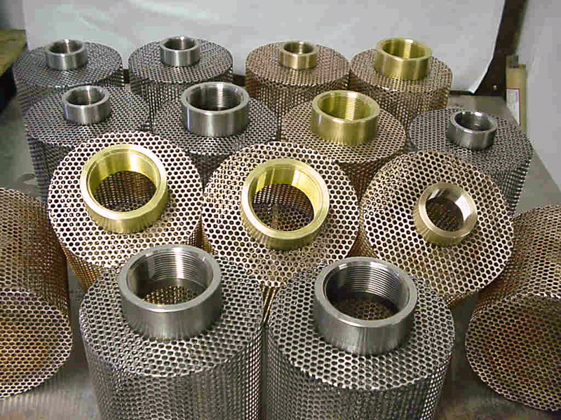 Perforated Monel and Copper discharge pump strainers with all welded Monel and Bronze female couplings.